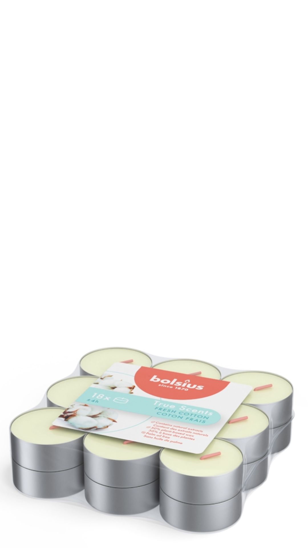 Omschrijving: Bolsius 18 geurtheelichtjes fresh cotton