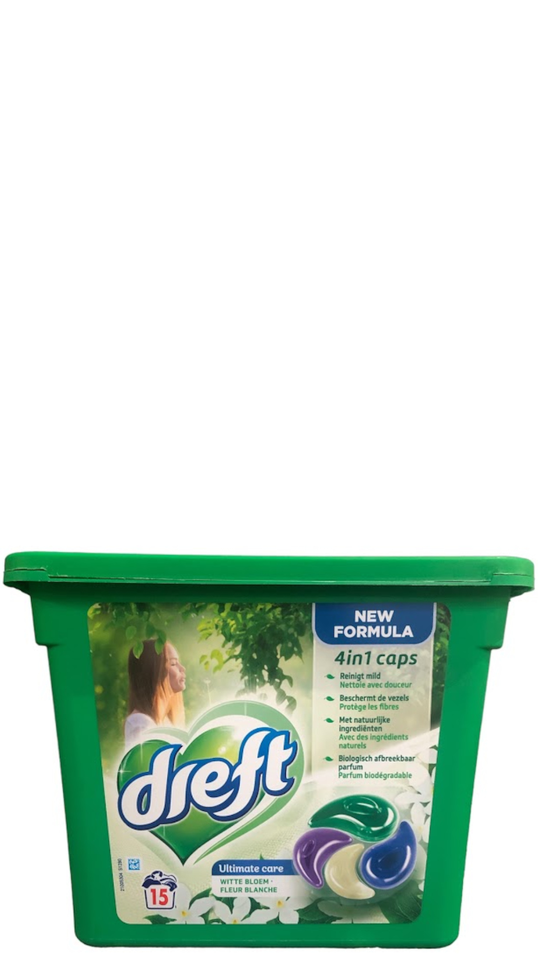 Omschrijving: Dreft Caps 4in1 – 15sc/330gr – ultimate care witte bloem